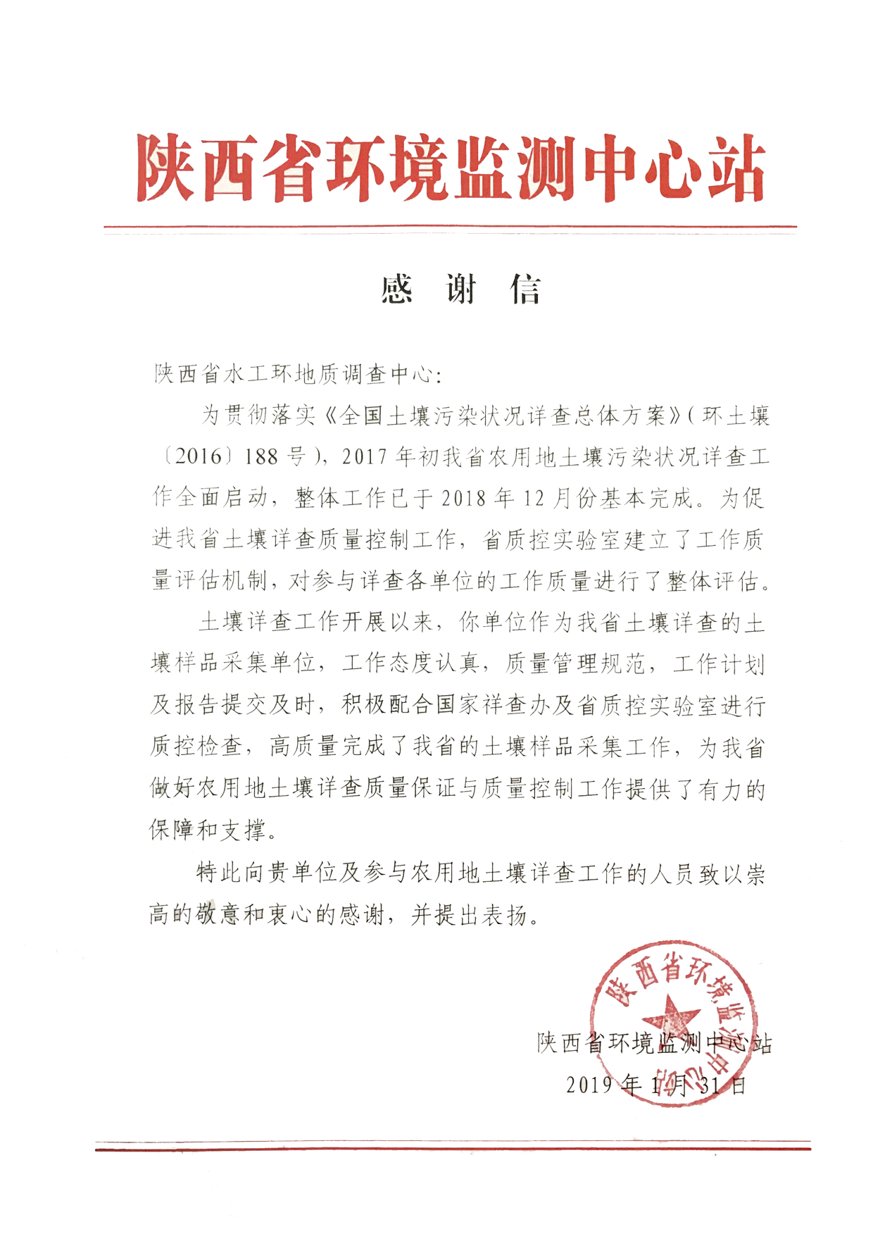 2019年1月31日陝西省環境監測中心站(省土壤詳查質控實驗室)下發了對我中心的感謝及表揚信,高度認可了我中心在“陝西省農用地土壤樣品采集”質量保證與質量控製工作中做出的貢獻,認為我中心工作態度認真、質量管理規範、工作計劃及報告提交及時、積極配合國家詳查辦及省質控實驗室的質量檢查工作,高質量地完成了我省農用地土壤樣品采集工作,為我省農用地土壤汙染狀況詳查質量保證與質量控製提供了有力的保障和支持。